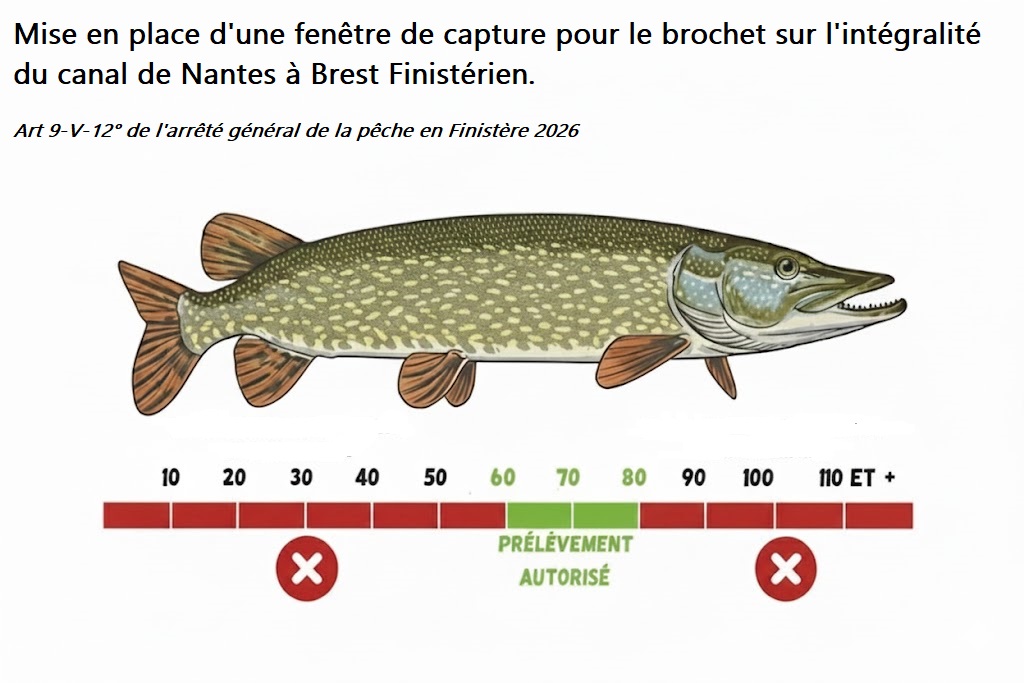 Les brochets dont la taille n'est pas comprise entre 60 cm et 80 cm doivent être remis à l’eau immédiatement, conformément à l’arrêté général de la pêche en Finistère 2026.